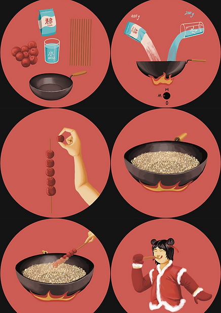 The process Infographic is a visual guide that breaks down the steps of making tanghulu into a clear and engaging format. The project focuses on transforming a complex process into accessible visual information through structured layout, sequencing, and simplified imagery. Created using digital illustration in Procreate, the work emphasizes clarity, readability, and visual communication, helping viewers easily understand each stage of the process.
