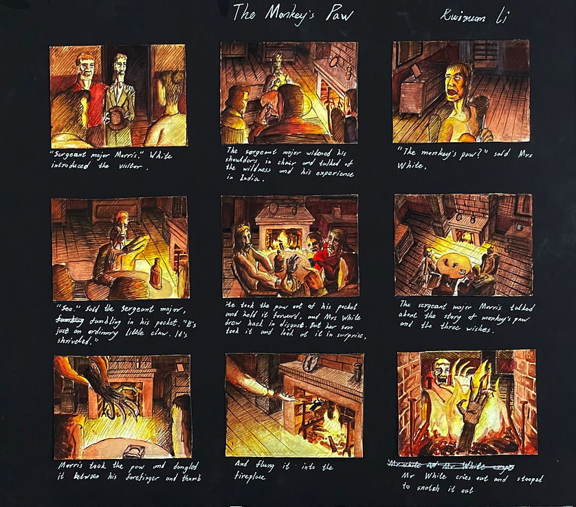 This project is a storyboard adaptation of selected chapters from The Monkey Paw. It explores the fundamentals of visual sequencing, pacing, and narrative translation from text to image. By interpreting key moments of the story through storyboard panels, the work develops an understanding of composition and cinematic storytelling. Created using watercolor, the project emphasizes atmosphere and mood, supporting the story’s suspenseful and unsettling tone while building a foundation for future comic and narrative illustration projects.